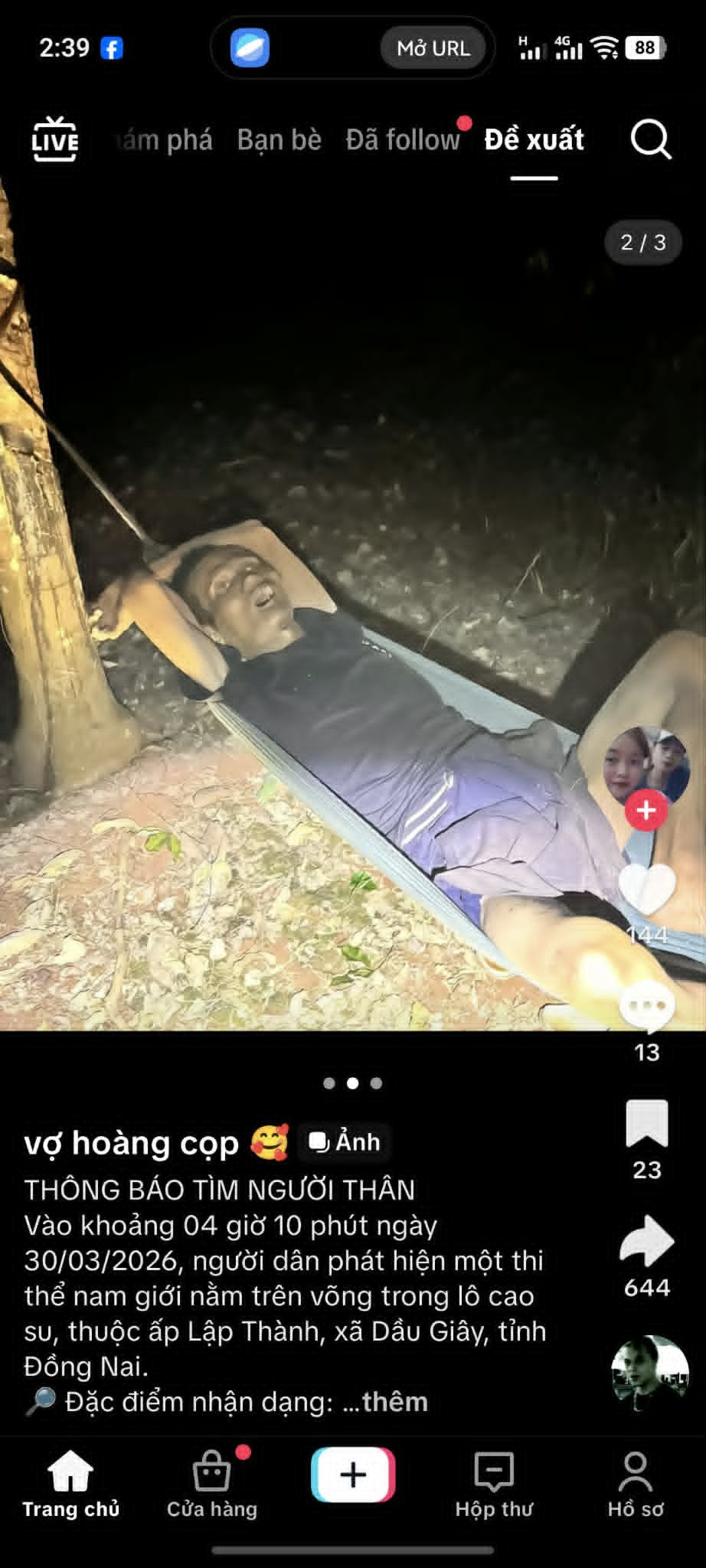 Vào khoảng 04 giờ 10 phút ngày 30/03/2026, người dân phát hiện một thi thể nam giới nằm trên võng trong lô cao su, thuộc ấp Lập Thành, xã Dầu Giây, tỉnh Đồng Nai.